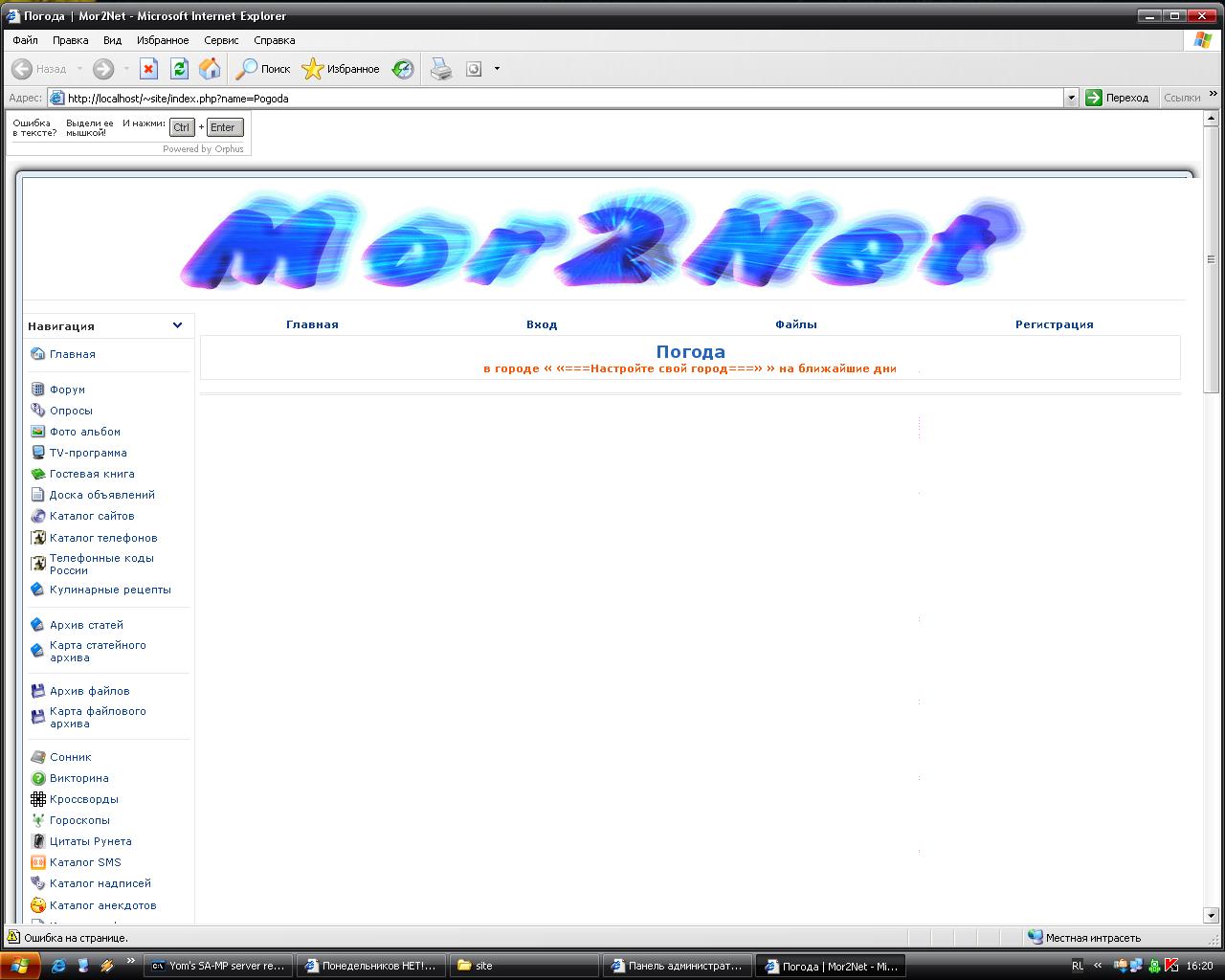 в городе Москва на ближайшие дни и Прогноз погоды предоставлен сервисом Gismeteo.вот всё...блин ппц.Сайт заходил через http://127.0.0.1 интернет включен.Версия слаеда 4.3.2